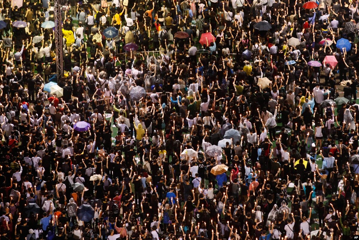 Tens of thousands of people attend a candlelight vigil under heavy rain at Victoria Park in Hong Kong, June 4, 2013 to mark the 24th anniversary of the Chinese military crackdown on the pro-democracy movement in Beijing.